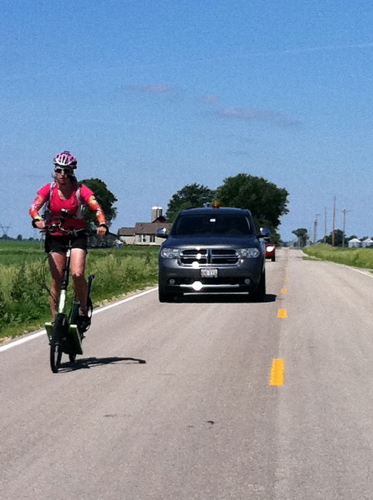 My part? I was the “crew chief”. What does that mean? I helped prepare the ElliptiGOs for the ride. [Yes, I’m a motor sports guy. We had the primary ride AND a back-up, fully prepared second ElliptiGO] I prepped the lead vehicle and the chase vehicle. I studied the course, prepared the maps, plotted the route on the GPS’s, and drove the lead vehicle. Deb Dean drove the chase vehicle, prepared all the food for Jenny and the team and set up all the aid stations. Kathy O’Malley and her grandson Tris Bucaro drove the media car and were the official photographers and videographers. And, Harry and Karly Spell provided on-course support and – yes – aerial support. Harry took Tris up in an airplane to get overhead shots.
