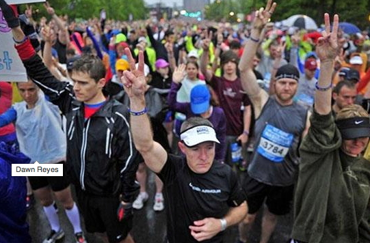 Just moments before the race was to start, we asked the participants to honor the spirit of Boston with a minute of silence. And, we asked them all to raise their hand and make the “Peace” sign. They did. 20,000 plus runners and wcmm3alkers in dead silence. Yep. I cried.